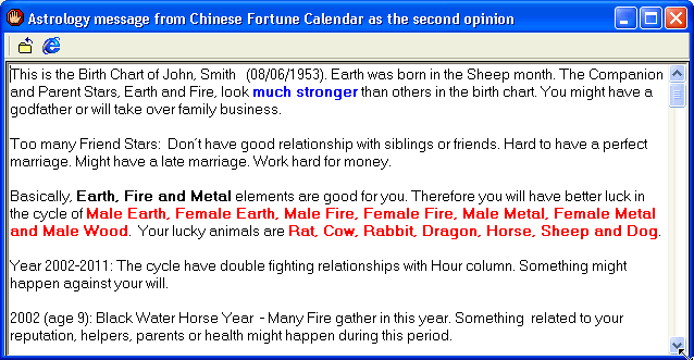 From the Chinese Fortune Calendar 10-God Birth Chart, you can have following message.